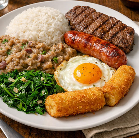 Para a montagem, use o arroz branco como base, coloque o virado de feijão ao lado, bife e linguiça por cima e finalize com o ovo frito, a banana e a couve. Sirva.