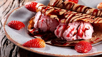 Para o recheio, decore um prato com os morangos, coloque uma panqueca e recheie com o sorvete de morango. Decore com a calda de chocolate e de morango e sirva.